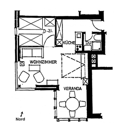 Im 3. Stock nach Süden und Westen gerichtet. Vorplatz mit Einbauschrank, Kochnische mit neuem Herd und Backofen, Geschirrspüler, Nespresso Kaffeemaschine. Grosser Kühlschrank mit Tiefkühlfach, Wohnzimmer mit Polstergruppe, Flat-TV mit Radio und gratis W-Lan. Eingeglaste Veranda mit Esstisch sowie einem Wandklappbett bestehend aus 2 einzelnen Betten. Ein separates, kleines Schlafzimmer nach Westen mit zwei getrennt stehenden Betten, kleine Dusche mit WC und Lavabo.